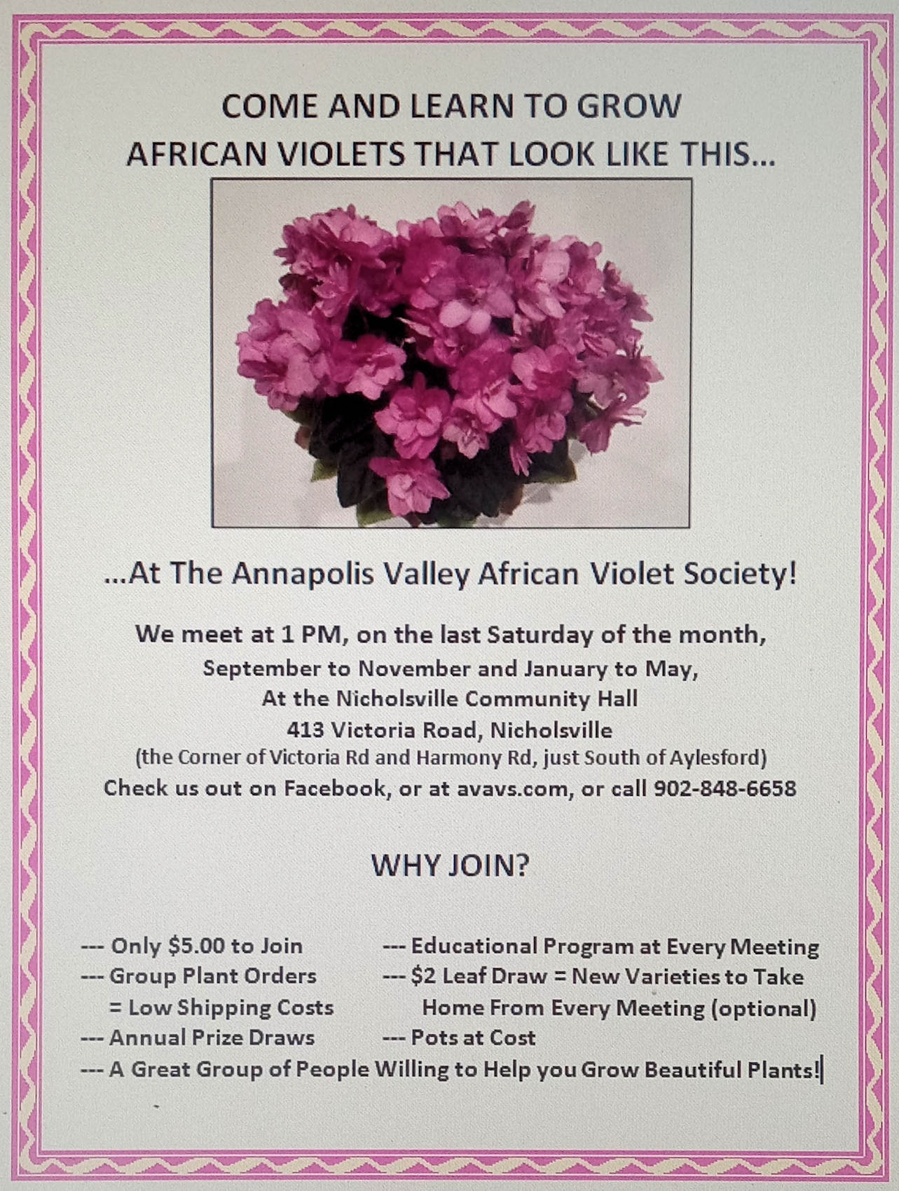 Below are links to information on growing and caring for AVs and Gesneriads Growing Streptoccarpus Submitted by: Frances Shilliday Growing Trailers Submitted by: Marie-Lyne Fackenthall Sowing African Violets from Seed Submitted by: Frances Shilliday Streptocarpus Seed Sowing and Transplanting by: Dale Martens Variegated African Violets Submitted by: Marie-Lyne Fackenthall Come and learn about AVs Click here for Info <